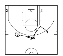 5 goes to set a ball screen on the left side of 1's defender then rolls.