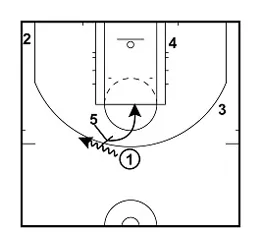1 makes a hard cut (jamming his defender) towards the free throw lane and cuts off of 5's downscreen.