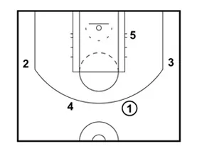The play starts in a 4 out 1 in set. The shooter is positioned on the left side. 2 is labeled as the shooter in this case.