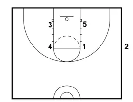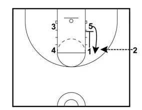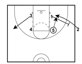 As soon as 5 receives the pass, 1 sets a backscreen for 2. 3 goes to the perimeter for spacing purposes.