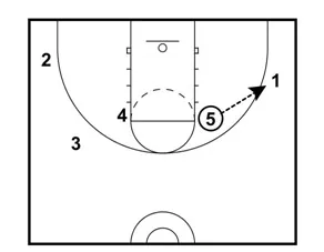 If 2 is not open, 5 makes a pass to 1. 5 can either set a ball screen or slide down to the block for a post up opportunity.