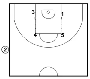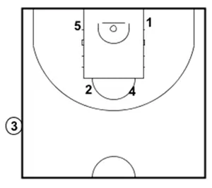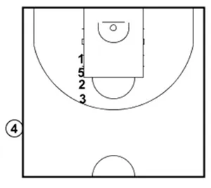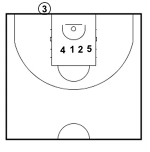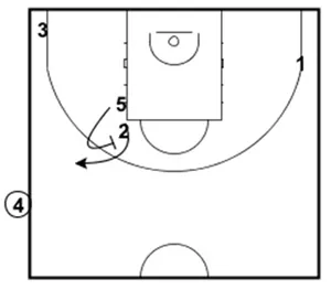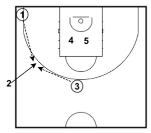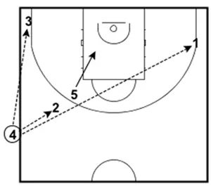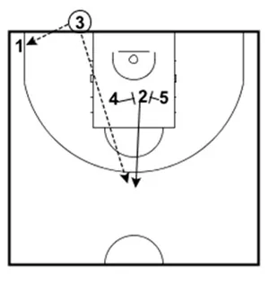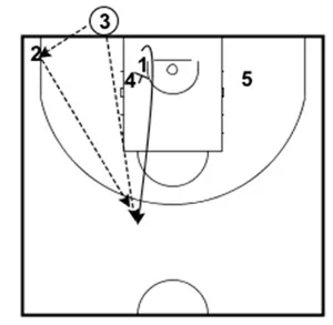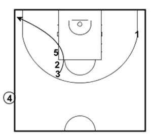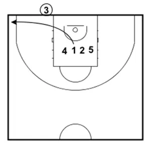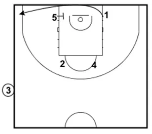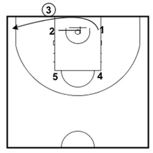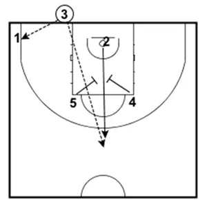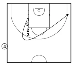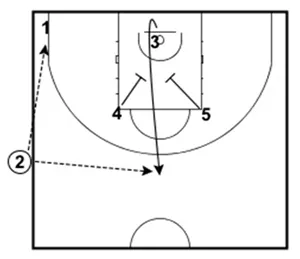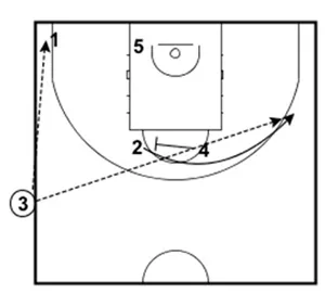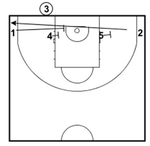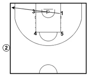 Passer looks over the top to 2 or corner to 1 for the shot.
