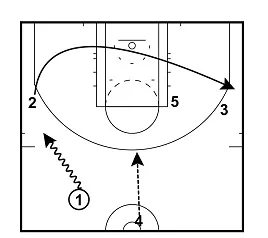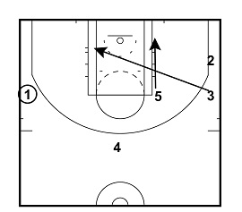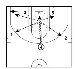 If Player 4 passes to Player 2, he can either set a ball screen for Player 2 or set a screen for Player 1, who could curl off it or go to the top of the three-point arc.
