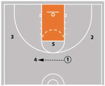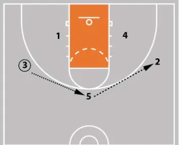 The 3 V-cuts or L-cuts to get open and receive a pass. After the pass is made, the 4 and the 1 both cut off the 5 at the high post, making an X. 1 stops at the block. 5 clears to the opposite corner. |