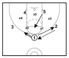 the point. - To draw the defense, 1 takes a dribble toward 3.
