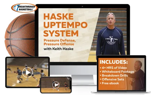 In this video set, you learn Keith Haske's uptempo defensive and offensive system that has helped him win over 650 games, reach the state championship 5 times with both boys and girls, and compile a 239-78 record (.753 win percentage) in his last 13 seasons.