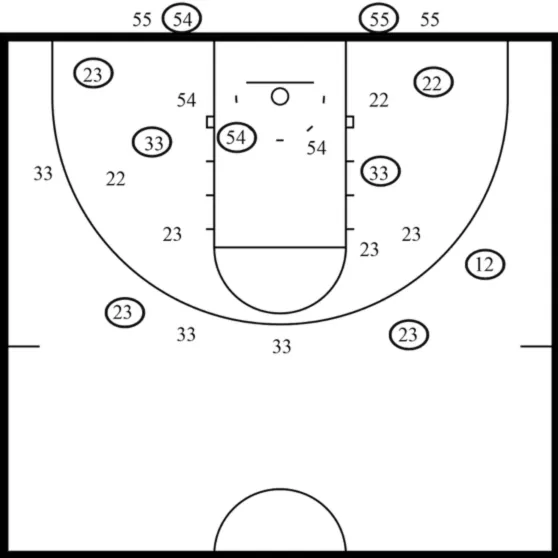 On the shot chart, you will see an approximation of the basketball court. Anytime a player takes a shot, write down the number of the player on the spot on the floor where the shot occurs. Then if the shot is made, circle the number. If the shot is missed, leave the number on the page without the circle. For lay-ups, write the numbers on the baseline on the side of the basket they were taken from. Those lay-ups taken from the left side are to the left of the basket. Those taken from the right should be on the right side of the basket. Post shots should be charted from where the shot was taken. Post shots should not be treated like lay-ups.