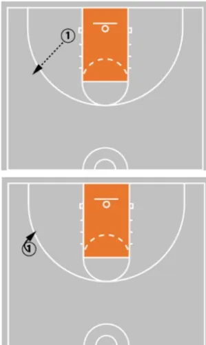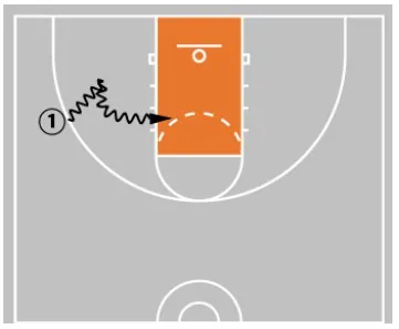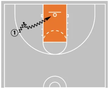 You begin underneath the basket with the ball. Use a spin out and throw the ball out to the three-point line. You will run out to get it and come to a quick stop.