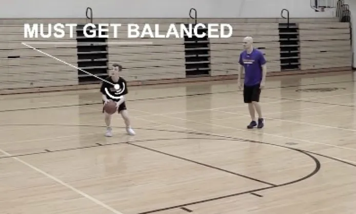 As you take the big lean, lunge step at the defender, it will cause them to retreat. Push backwards off your outside foot and land balanced, ready to shoot. Next, flow quickly into your jump shot.